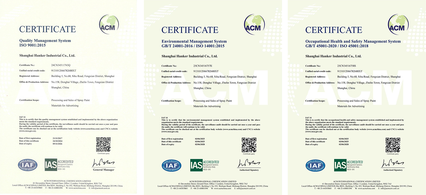 Recentemente, Shanghai Hanker Industrial Co., Ltd. (indicato come "Hanker") ha ottenuto con successo la certificazione del sistema di gestione della salute e della sicurezza per la salute dell'ACM Limited ISO 14001, e certificazione ISO 14001 e la certificazione ACM International. Questo risultato dimostra che l'azienda ha soddisfatto completamente gli standard internazionali in termini di controllo di qualità, protezione ambientale e sicurezza dei dipendenti. L'acquisizione di queste tre certificazioni di sistema è il risultato dell'impegno a lungo termine di Hanker per la gestione standardizzata. Ottimizzando i processi di produzione, stabilendo meccanismi di prevenzione e controllo del rischio ambientale e migliorando i sistemi di formazione sulla salute e sulla sicurezza professionale, l'azienda ha raggiunto il controllo standardizzato sull'intera catena dall'approvvigionamento di materie prime alla consegna del prodotto finito. In futuro, prendendo queste certificazioni come fondazione, Hanker approfondirà ulteriormente l'innovazione tecnologica e il potenziamento della gestione, promuoverà attivamente la cooperazione di ricerca università di industria con le università, esplorerà le applicazioni all'avanguardia nel campo dei materiali e contribuirà allo sviluppo di alta qualità del settore. $ .